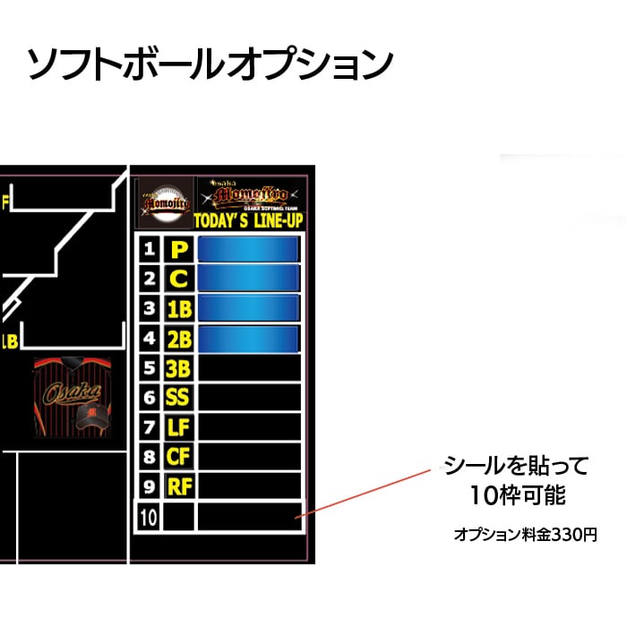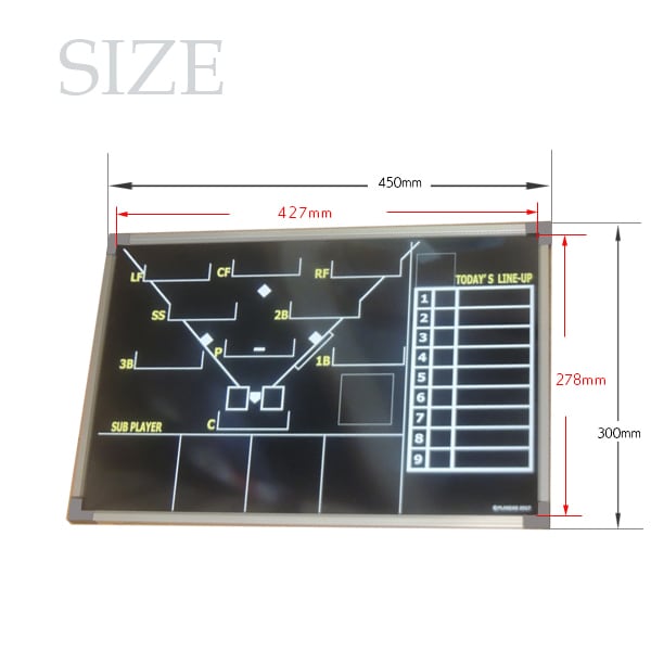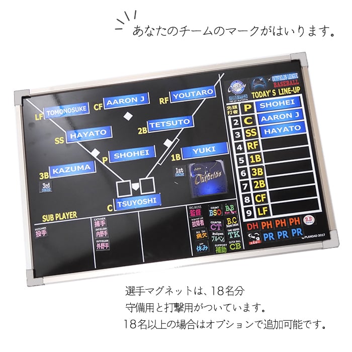 ラインナップボードは、選手の名前やポジションを分かりやすく表示できる便利なツールです。18名分の選手マグネット付き(18名以上は10名まで+880円、20名まで+1540円、30名まで+1980円)。別途、備考欄に希望人数を記入してください。選手名をいただいてから、納期は約1週間が目安です。